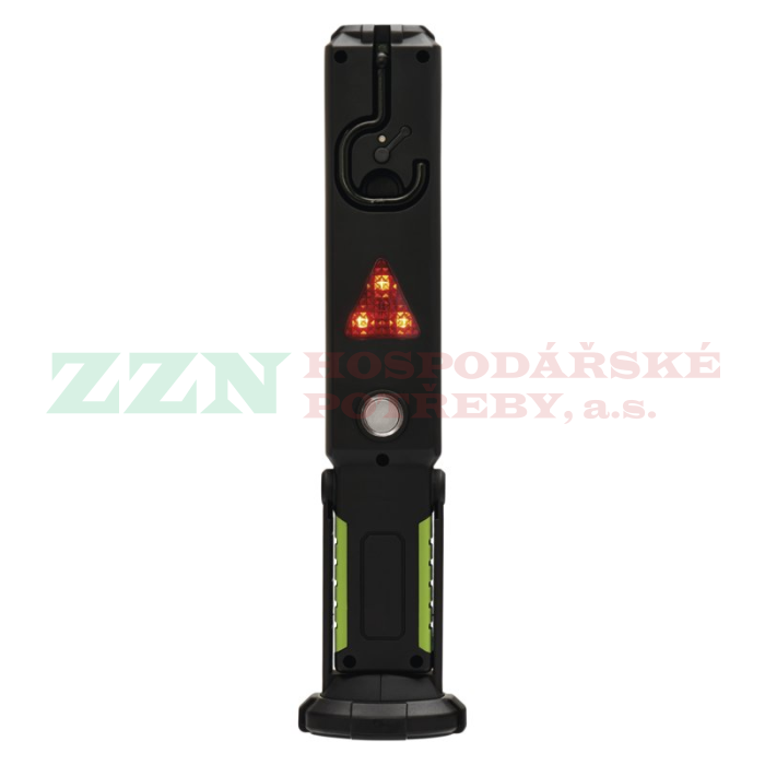 • Součástí je i varovný svítící LED trojúhelník, praktický hák a magnet pro zavěšení svítilny a napájecí zdroje do sítě i automobilu.