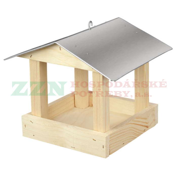 Dřevěné krmítko pro ptáky v přírodním provedení s odolnou pozinkovanou střechou a háčkem na zavěšení.