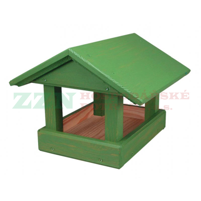 Dřevěné krmítko pro ptáky v zeleném provedení.