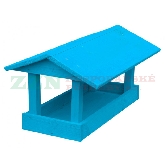 Dřevěné krmítko pro ptáky v modrém provedení.