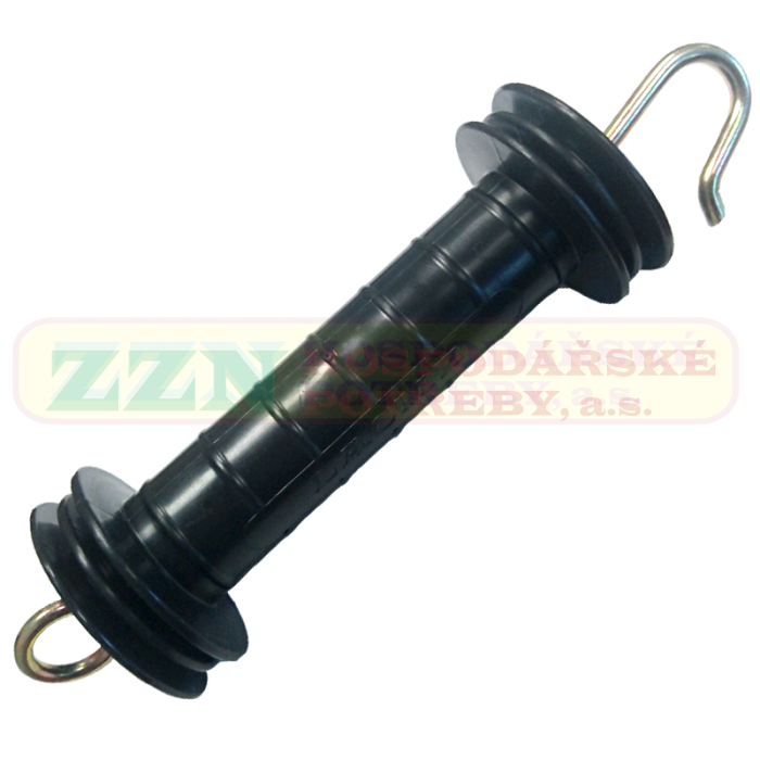 Vodivá rukojeť pro vstupy do elektrického oplocení. Typ LACME střední se zakrytou pružinou. Celková délka 22cm, délka plastové rukojeti 14cm, O držadla 3cm. Černá barva.